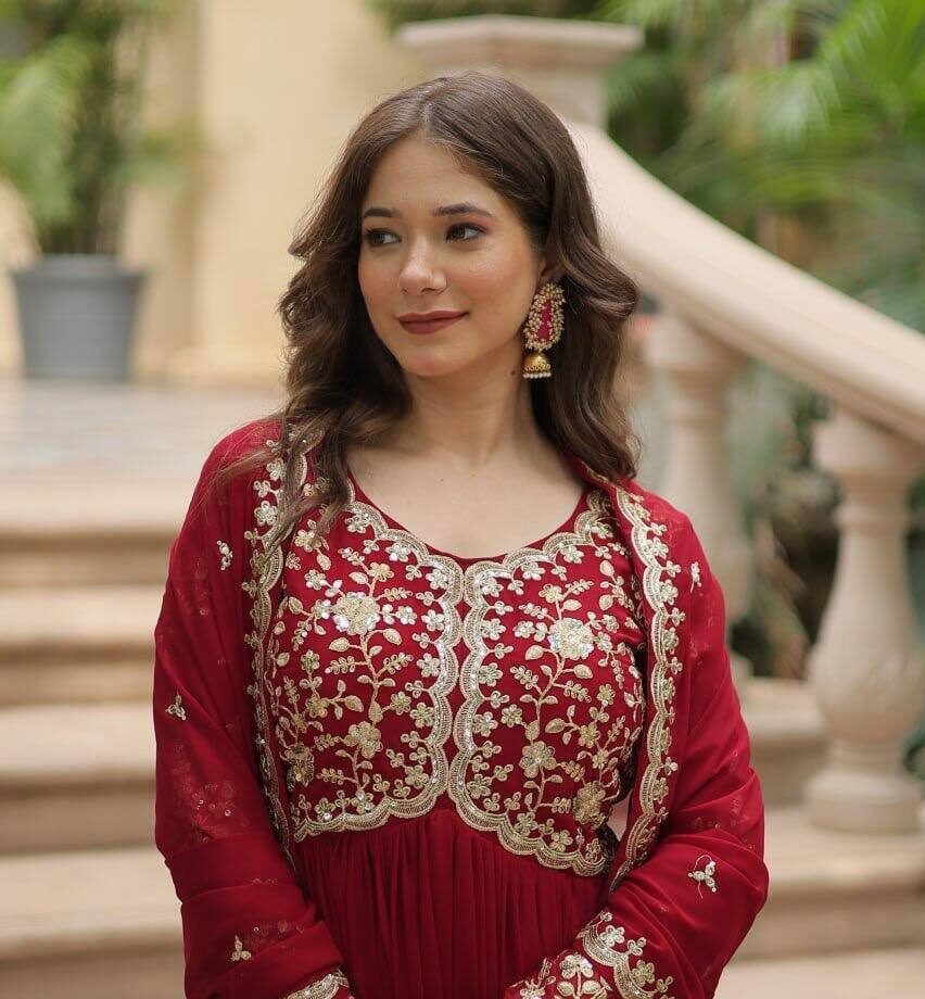 Styling Tip: Enhance the warmth of the maroon tones by pairing this gown with antique gold jewelry or kundan sets. A sleek low bun will highlight the detailed embroidery on the neck and shoulders.
