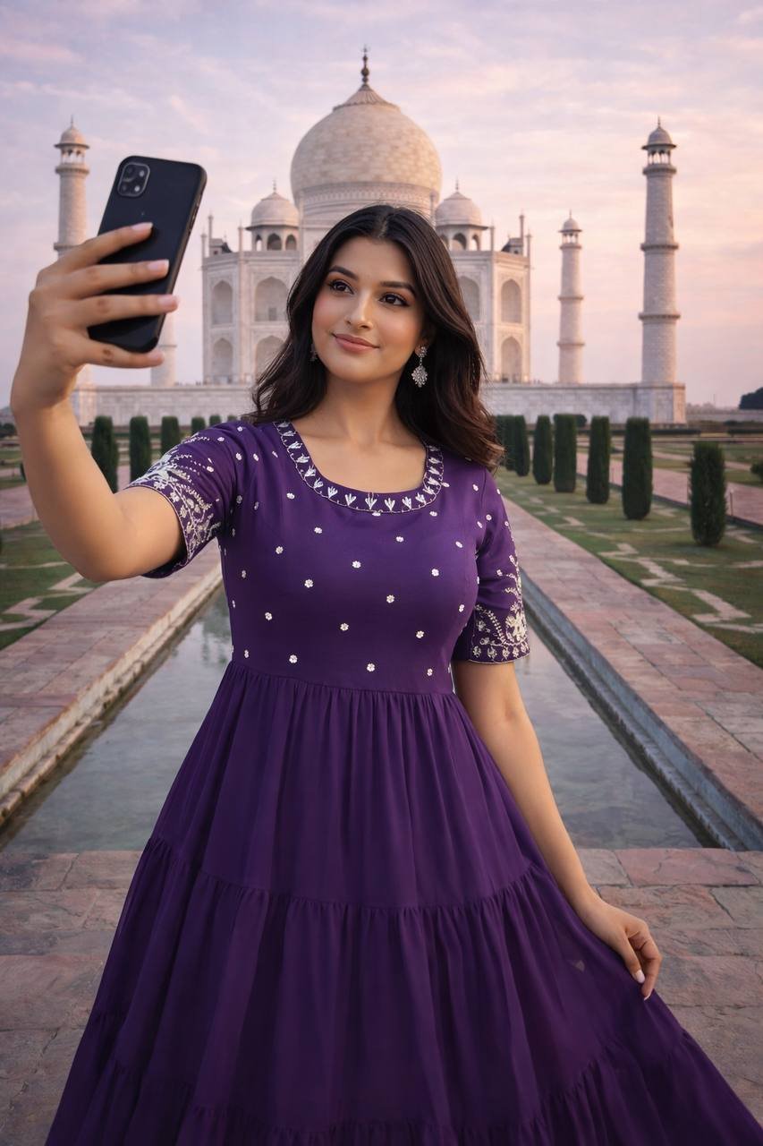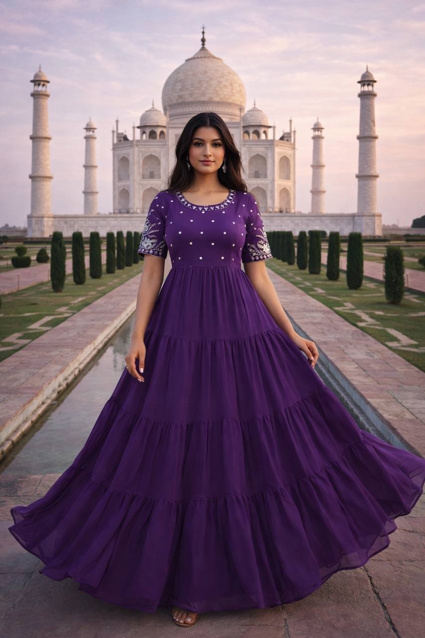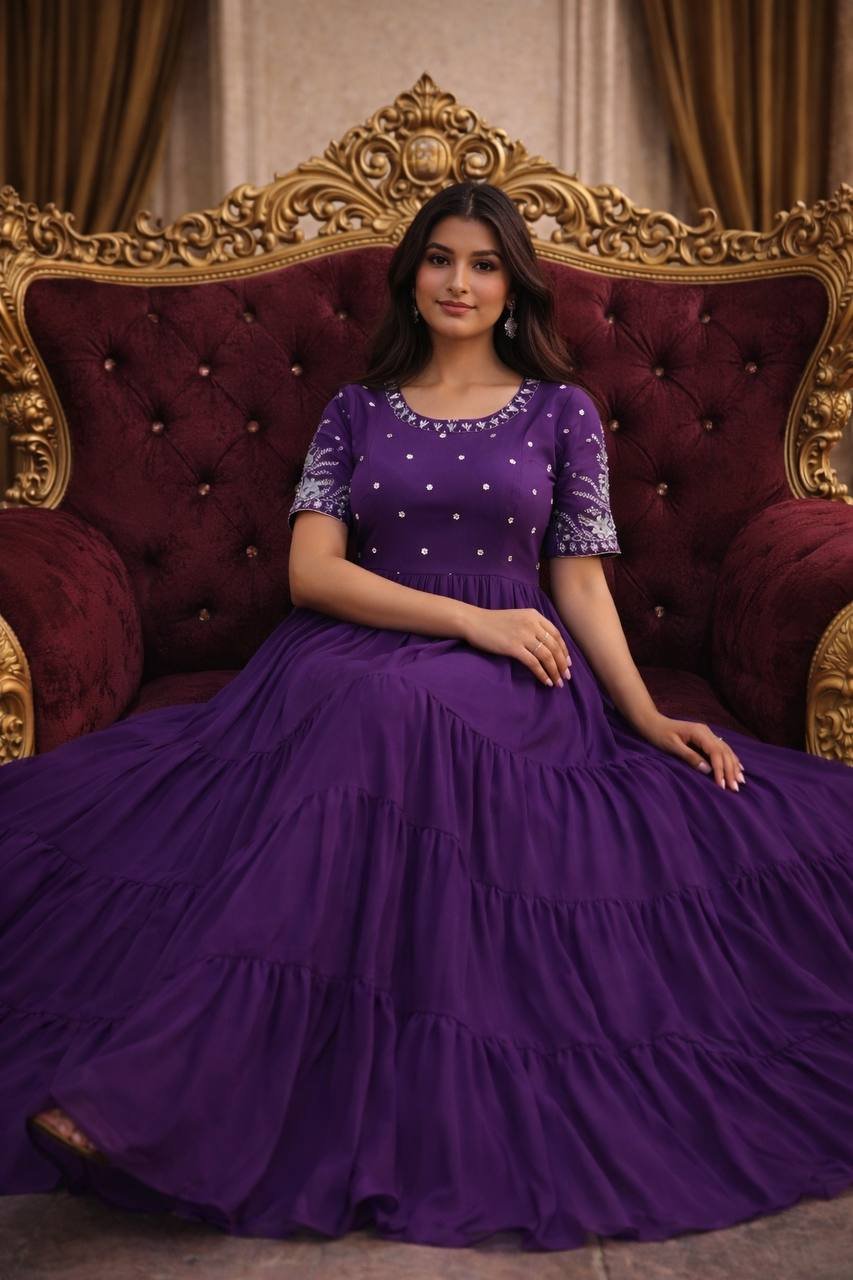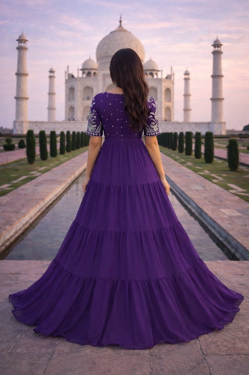 Styling Tip: Accentuate the rich purple hue and shimmering zari work by pairing this gown with silver statement earrings and a sleek, high bun to let the detailed neckline shine.