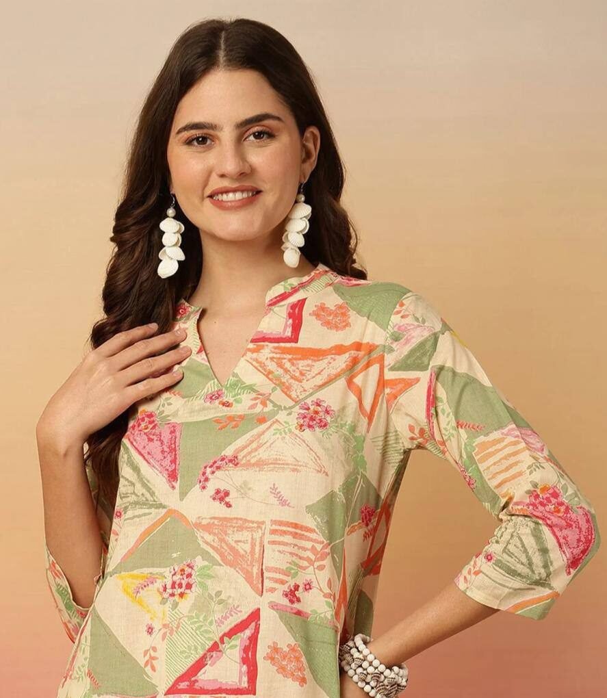 Artistic Print: Decorated with a vibrant Digital Print showcasing a contemporary geometric and botanical pattern in a refreshing palette of sage green, coral, and soft pink against a light cream background.