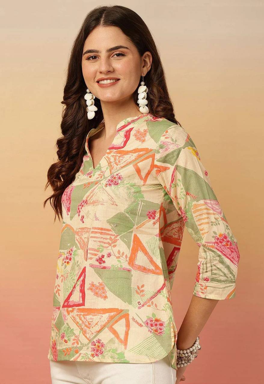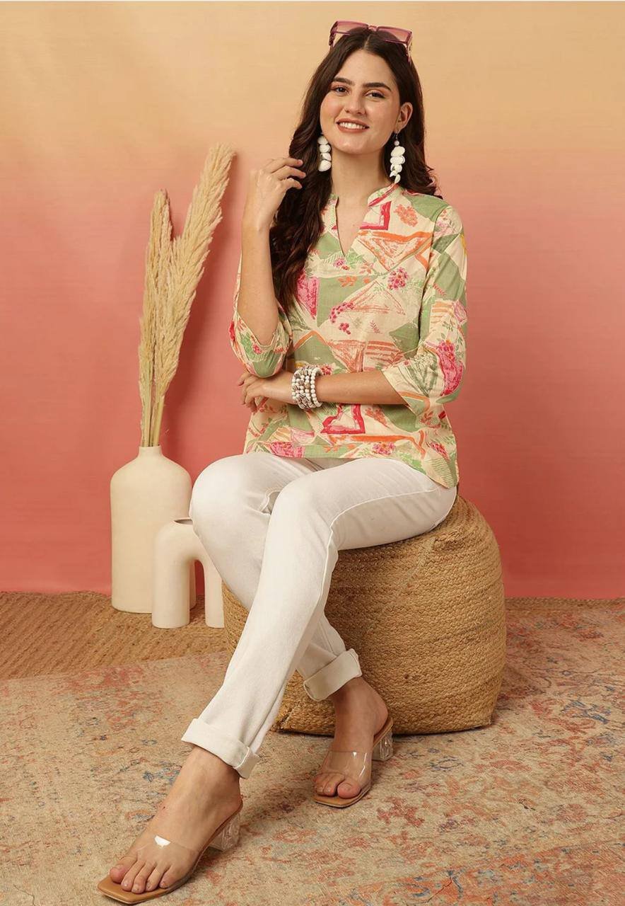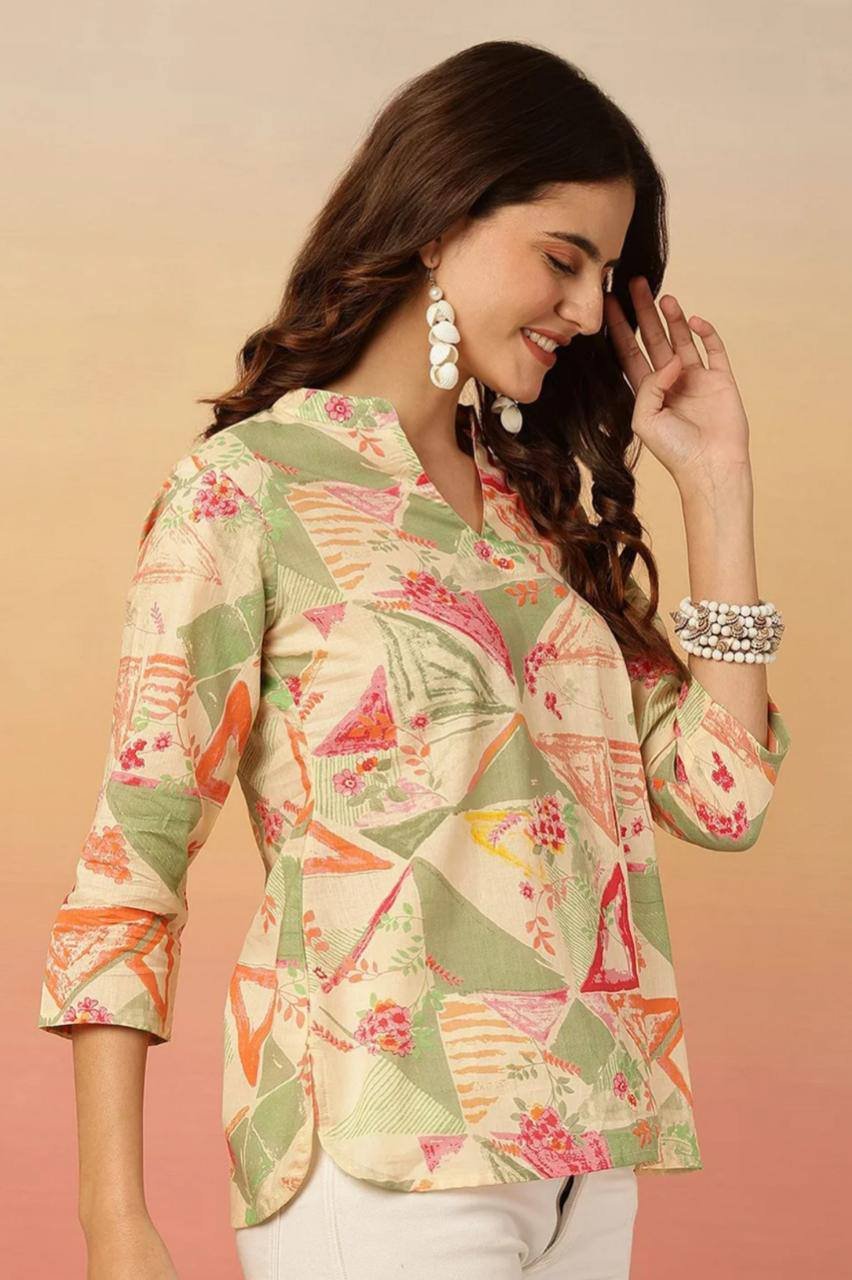 Design & Style: A fresh and artistic Western-style Top featuring a sophisticated mandarin collar and a clean V-neckline. This piece offers a relaxed yet flattering silhouette with a curved hem, making it an essential staple for a modern, versatile wardrobe.