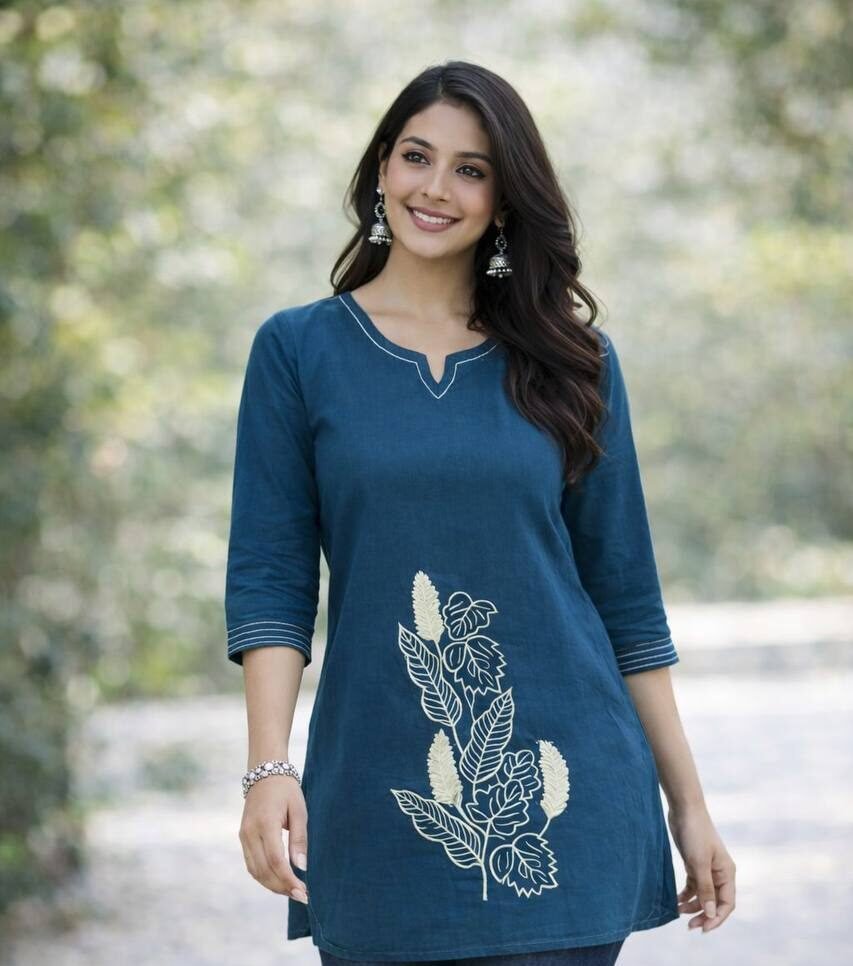 The tunic is perfectly paired with flowing, wide-leg off-white Rayon palazzos, providing a clean contrast that highlights the rich, forest-inspired tones of the top. This “ready-to-wear” outfit is designed for the modern woman who values a seamless blend of traditional motifs and a chic, modern cut.