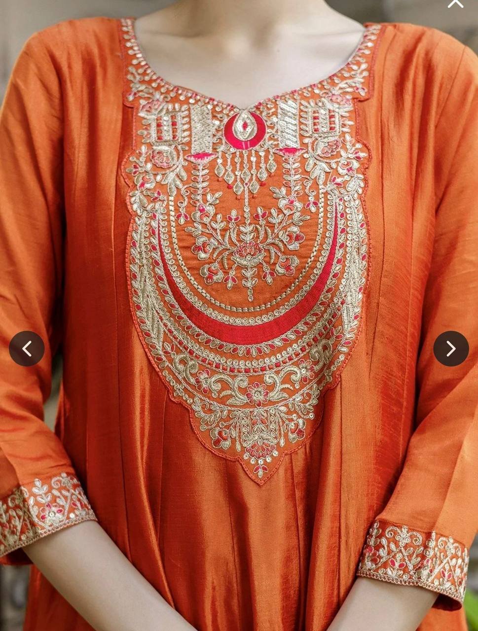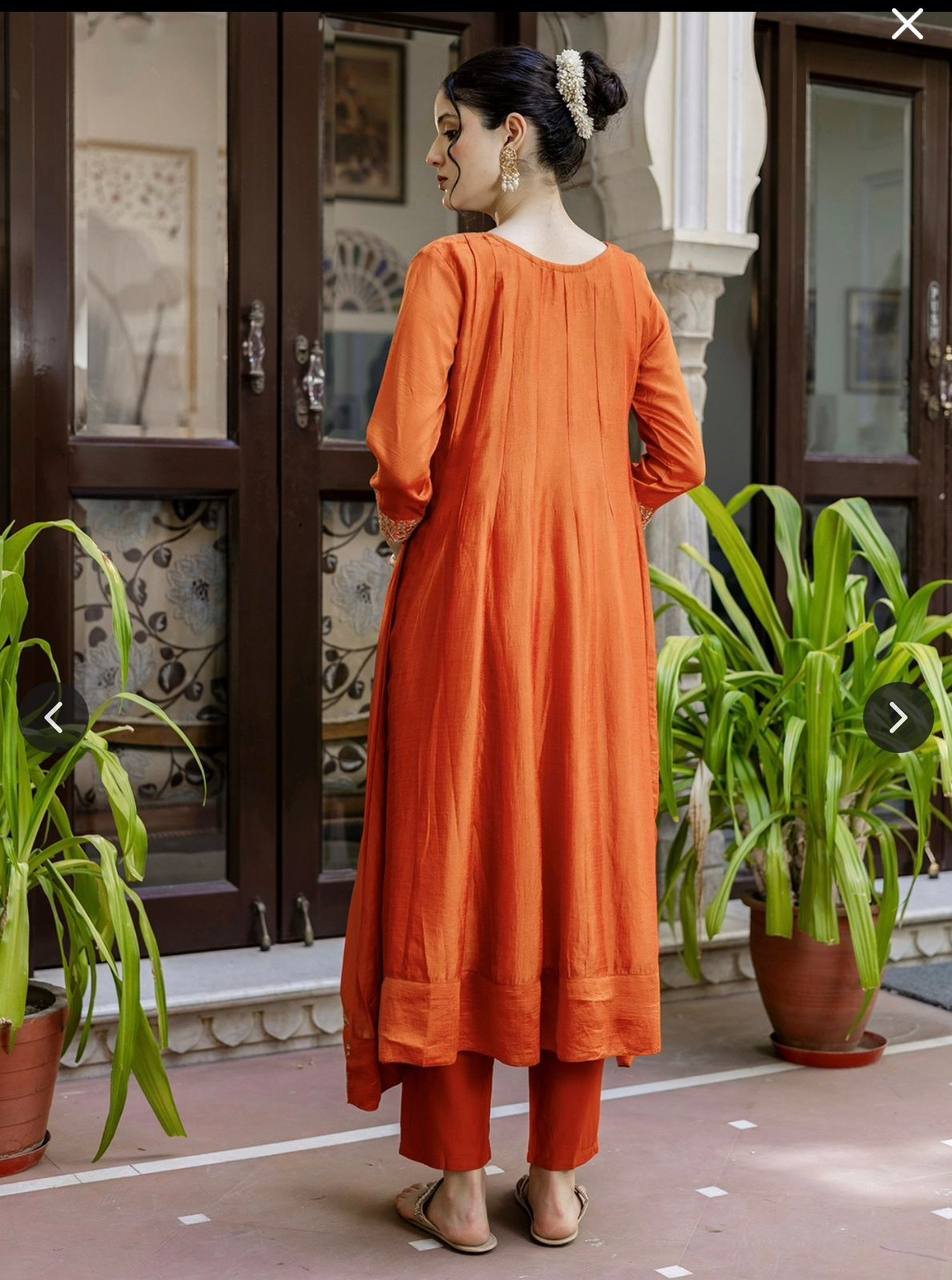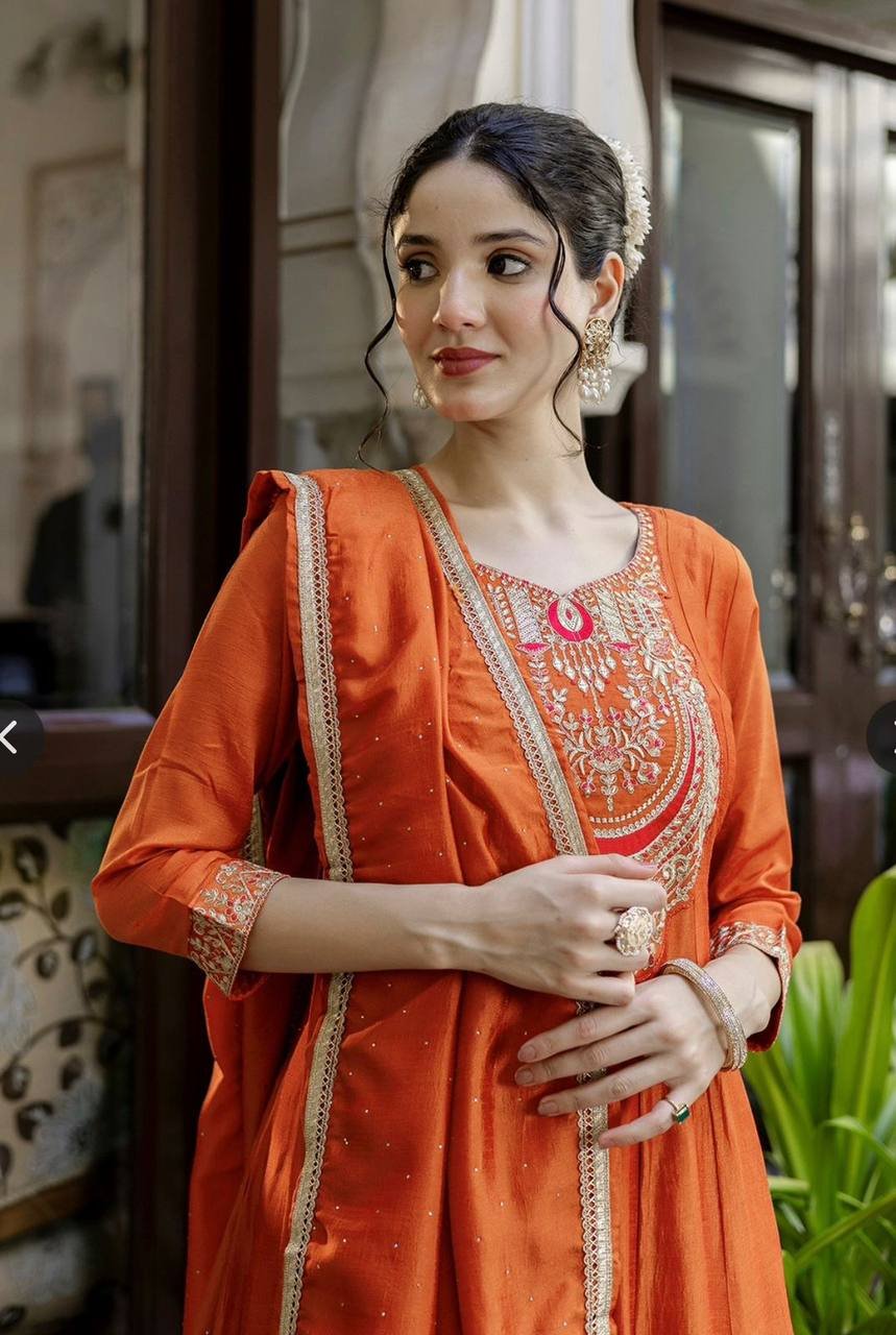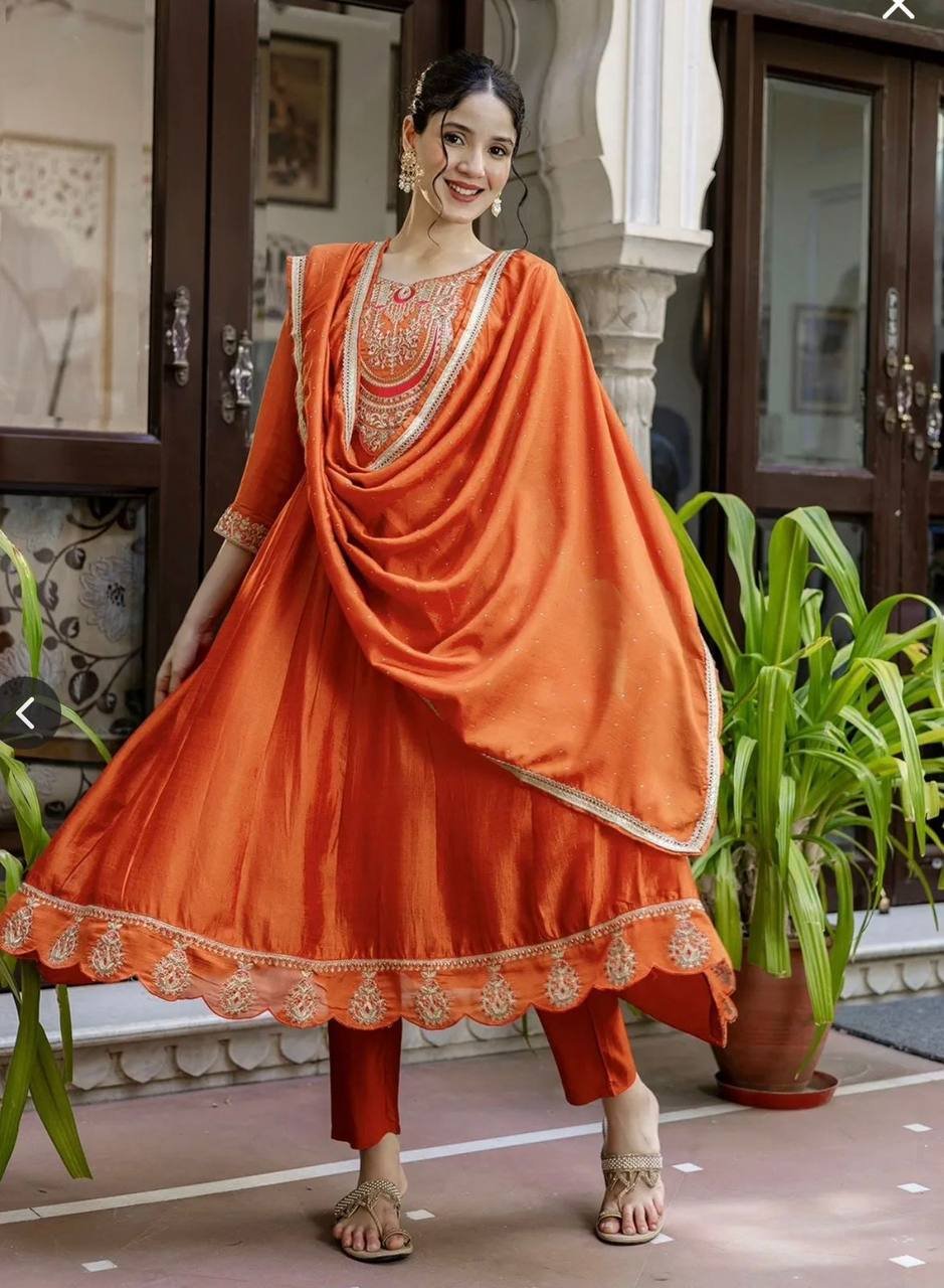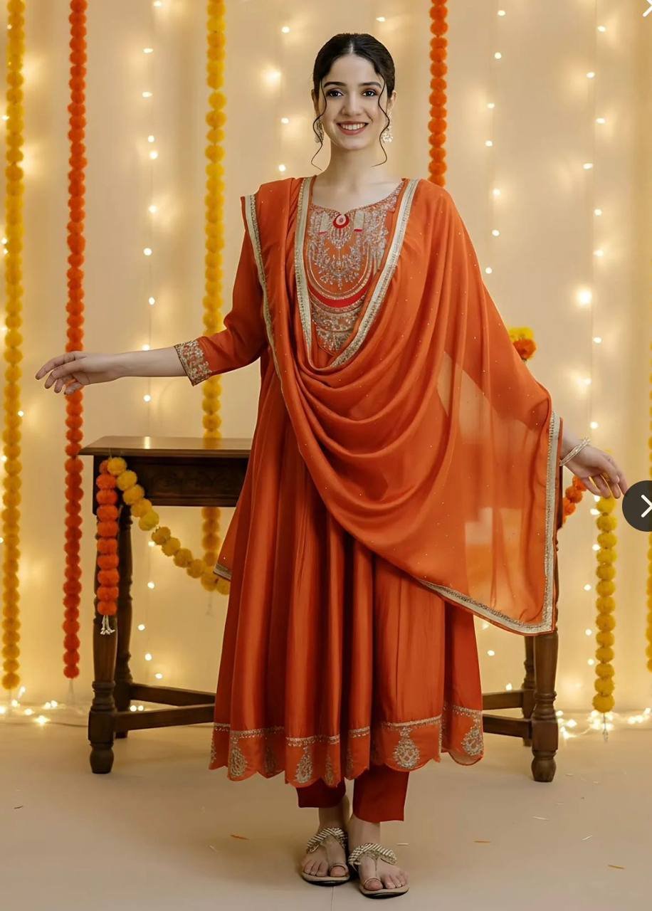 Elevate your festive wardrobe with the Rust Radiance Vichitra Silk Anarkali Set, a masterpiece of traditional craftsmanship and vibrant color. The rich rust-toned fabric acts as a perfect canvas for the intricate golden embroidery and delicate thread-work. With its classic round neckline and voluminous flared silhouette, this ensemble offers a timeless look that remains deeply rooted in ethnic elegance.