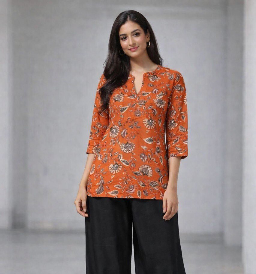 Radiate warmth and effortless elegance with this vibrant two-piece co-ord set. The tunic, rendered in a beautiful rust-orange shade, is crafted from premium Rayon Slub and features a detailed botanical digital print. With its modern notched neckline and comfortable 3/4 sleeves, this top provides a sophisticated silhouette that pairs perfectly with the fluid, wide-leg black Rayon palazzos.