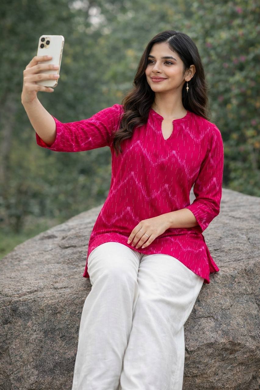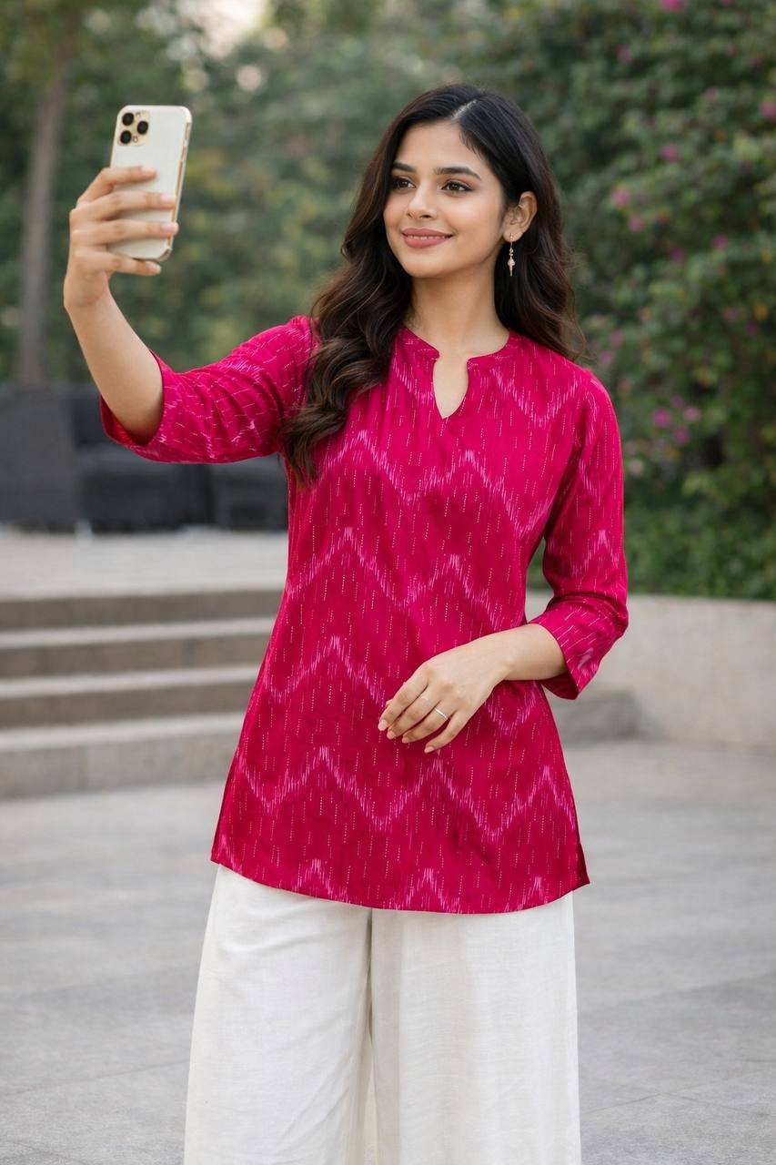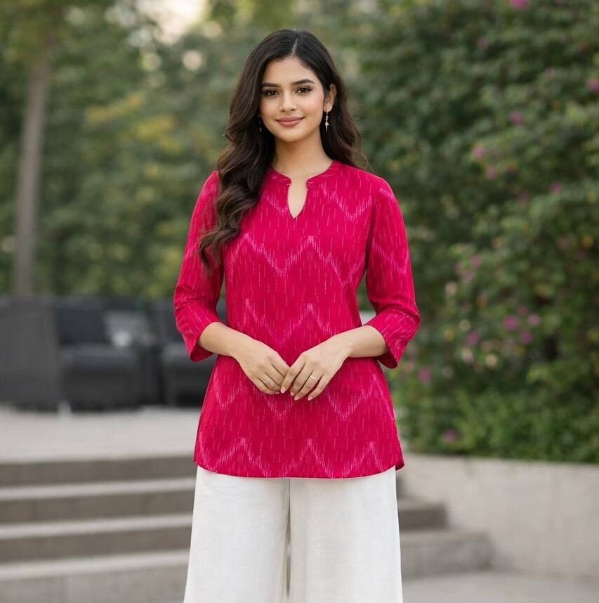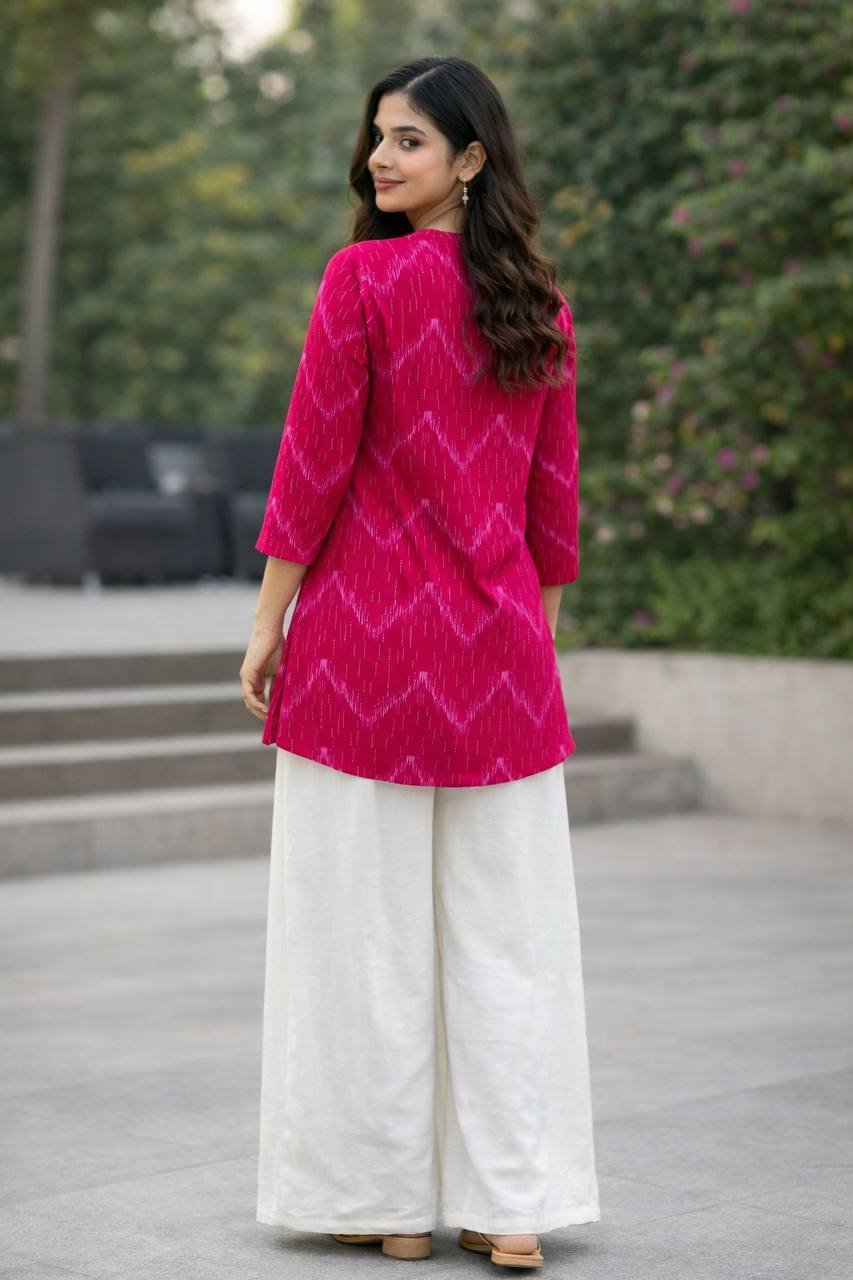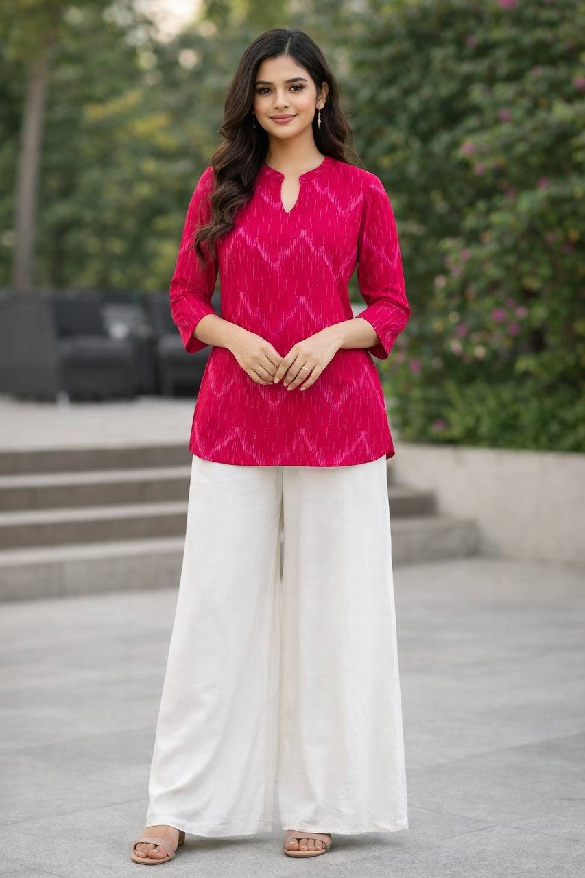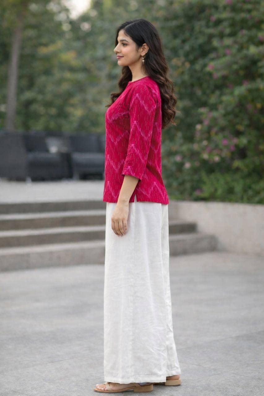 The tunic is paired with flowing, wide-leg off-white Rayon palazzos, creating a light and airy contrast that ensures maximum comfort. This ready-to-wear set is ideal for those who appreciate a minimalist yet detailed aesthetic for office hours or daytime social gatherings.